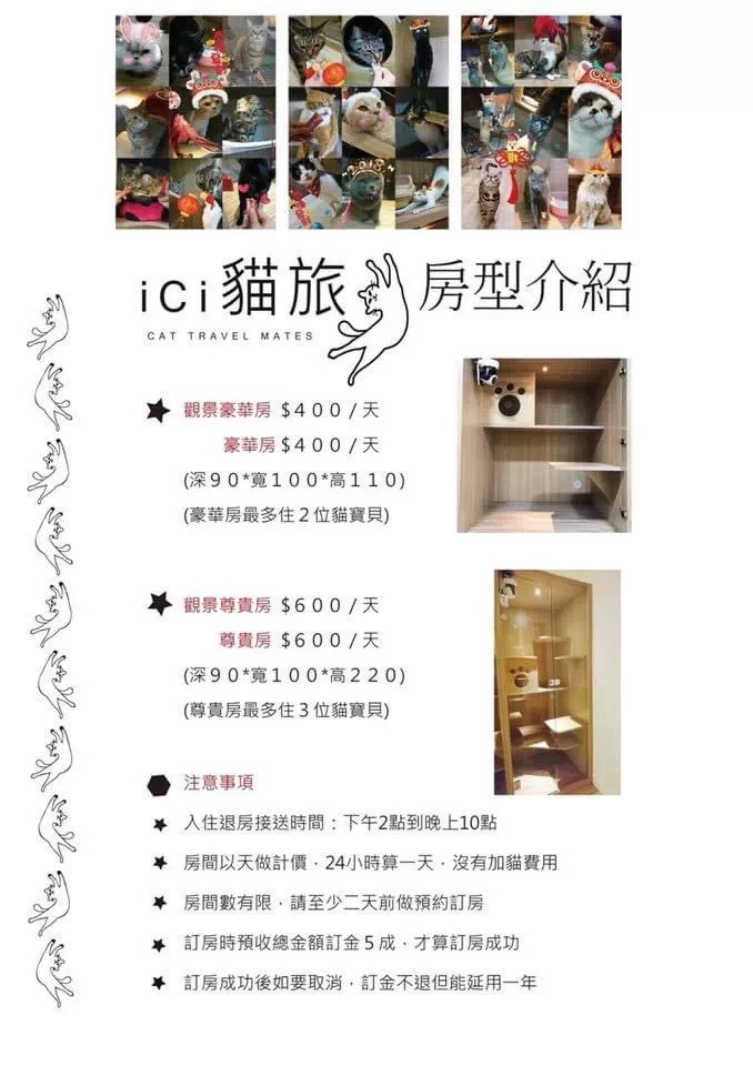 收熟客或是推薦的,因家裡當天失火,晚上臨時前往並告知狀況~ 很感謝貓旅破例收貓咪♥每個人員都很親切,貓櫃空間剛好不擁擠,環境很乾淨很舒適!貓咪還有遊戲室可以放風一下,另有監視器讓貓奴遠端看寶貝,大推~~